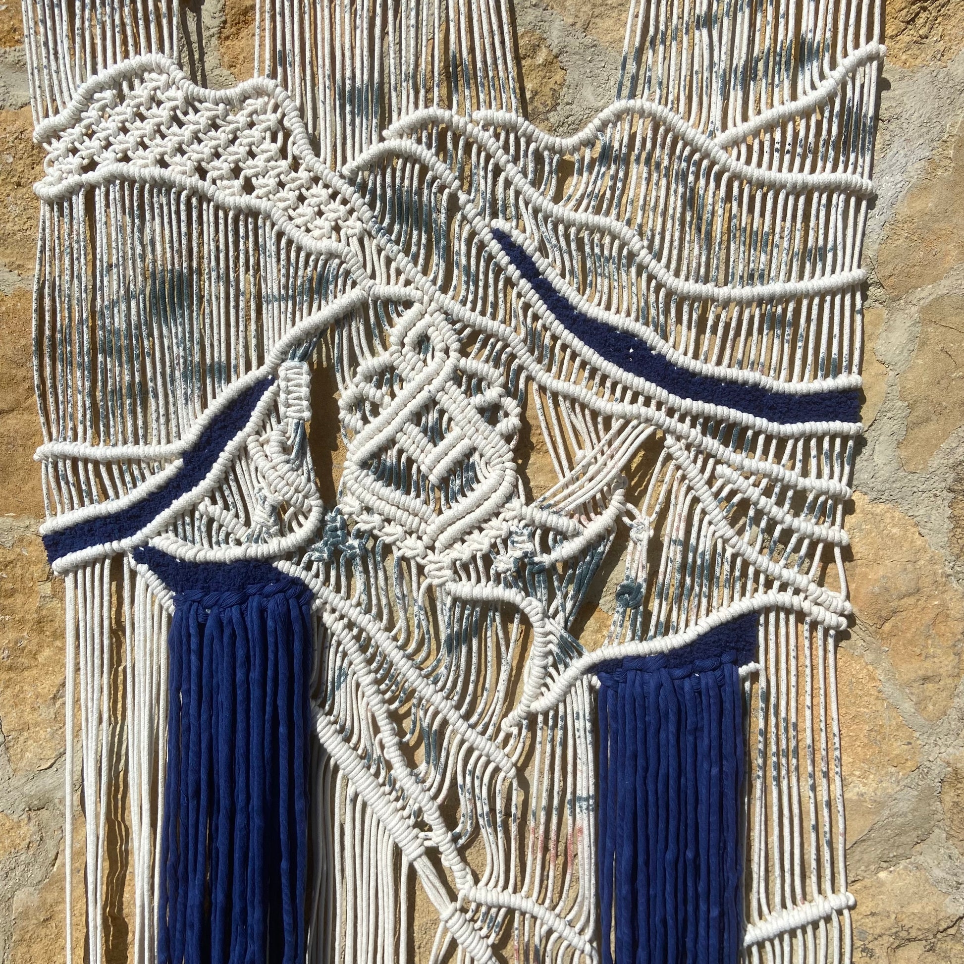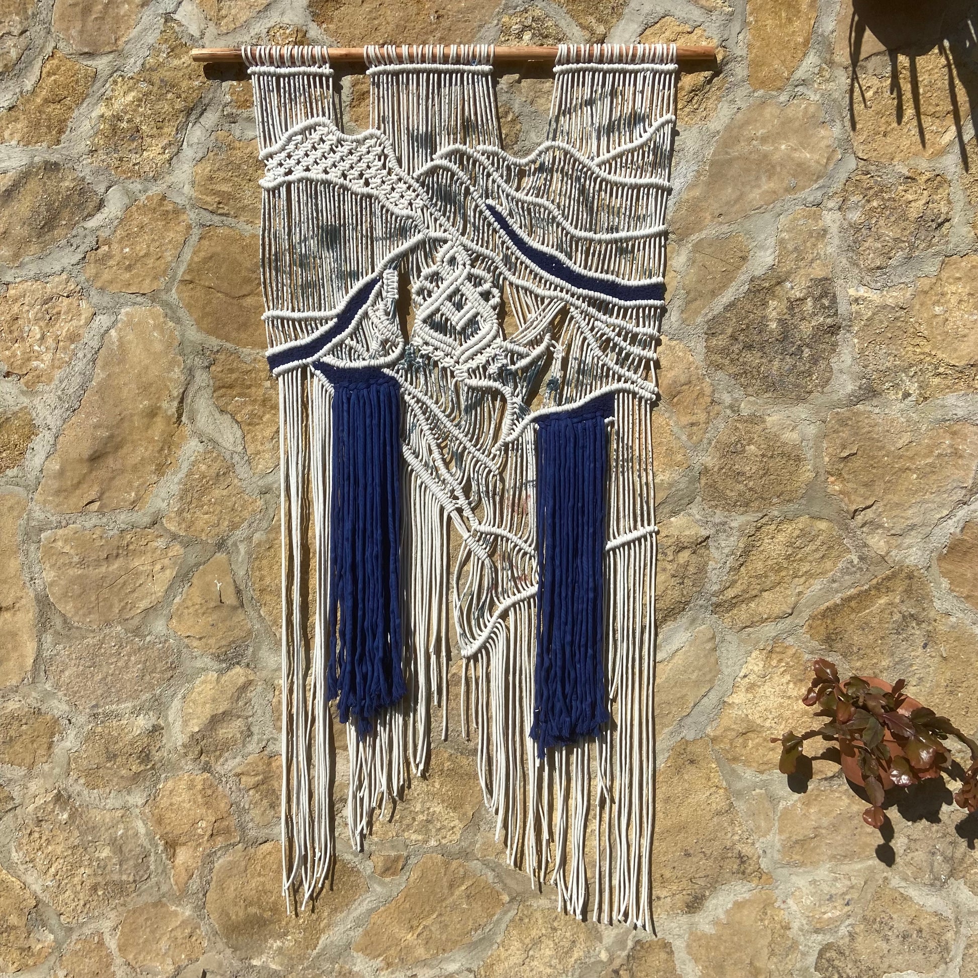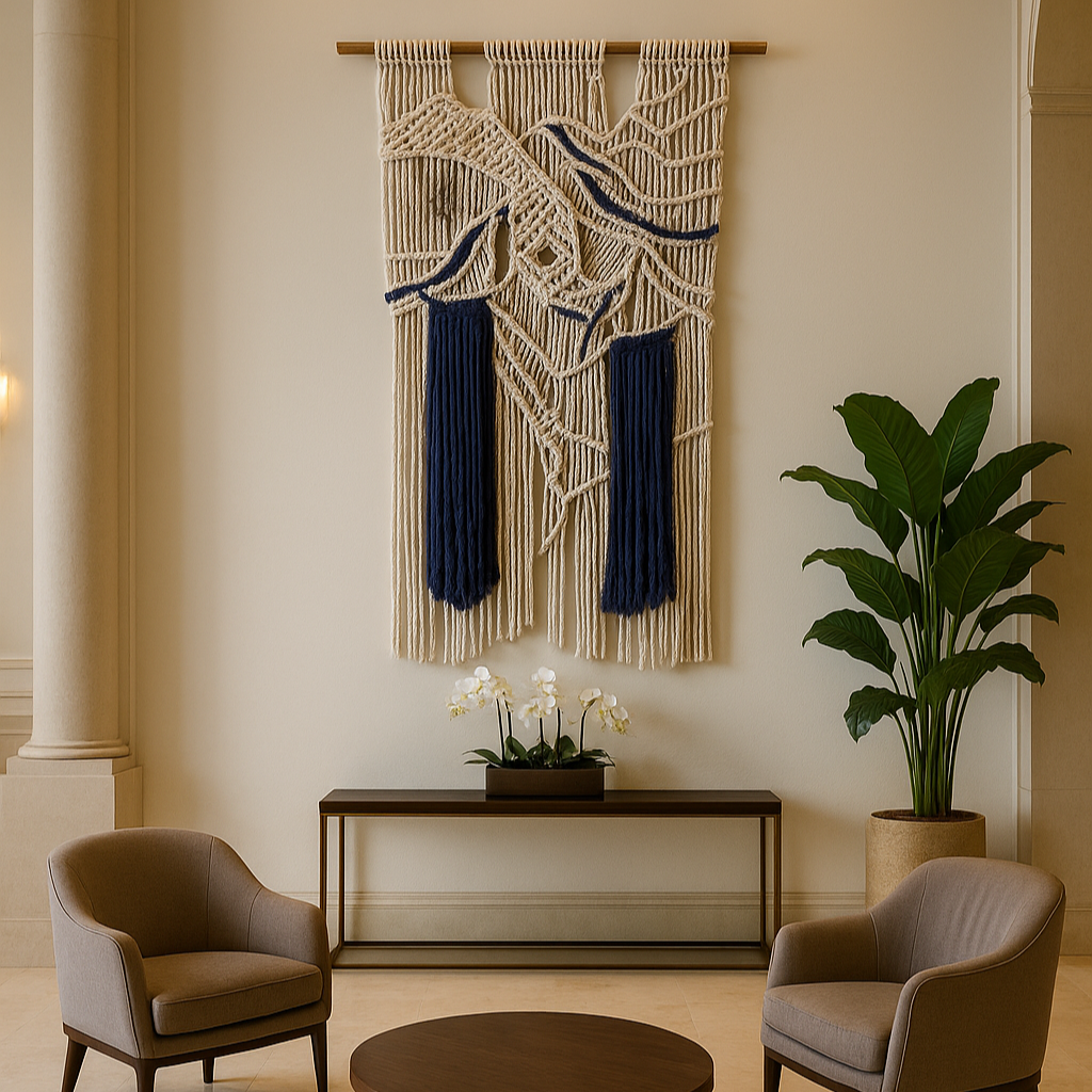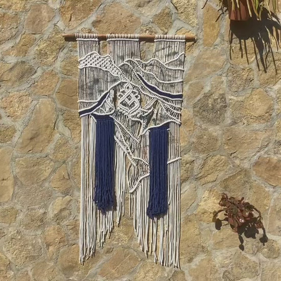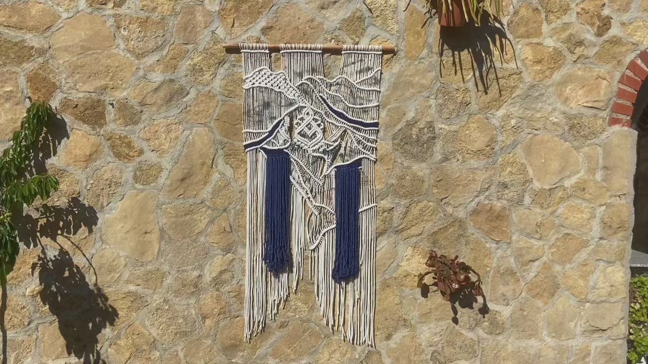 Contempla 'Éter y Profundidad Textil', una pieza de macraweaving contemporánea donde la ligereza de las formas marfil y crema se encuentra con la intensidad de un azul cobalto profundo. Sus estructuras tridimensionales, tejidas a mano con una precisión exquisita, parecen flotar, creando un contraste visual y táctil fascinante. La cascada de hilos azules añade una dimensión de movimiento y profundidad, convirtiendo este tapiz único en un punto focal de elegancia moderna. Montado sobre una varilla de bambú natural, es una declaración de arte textil para interiores que valoran la originalidad y el diseño sofisticado.