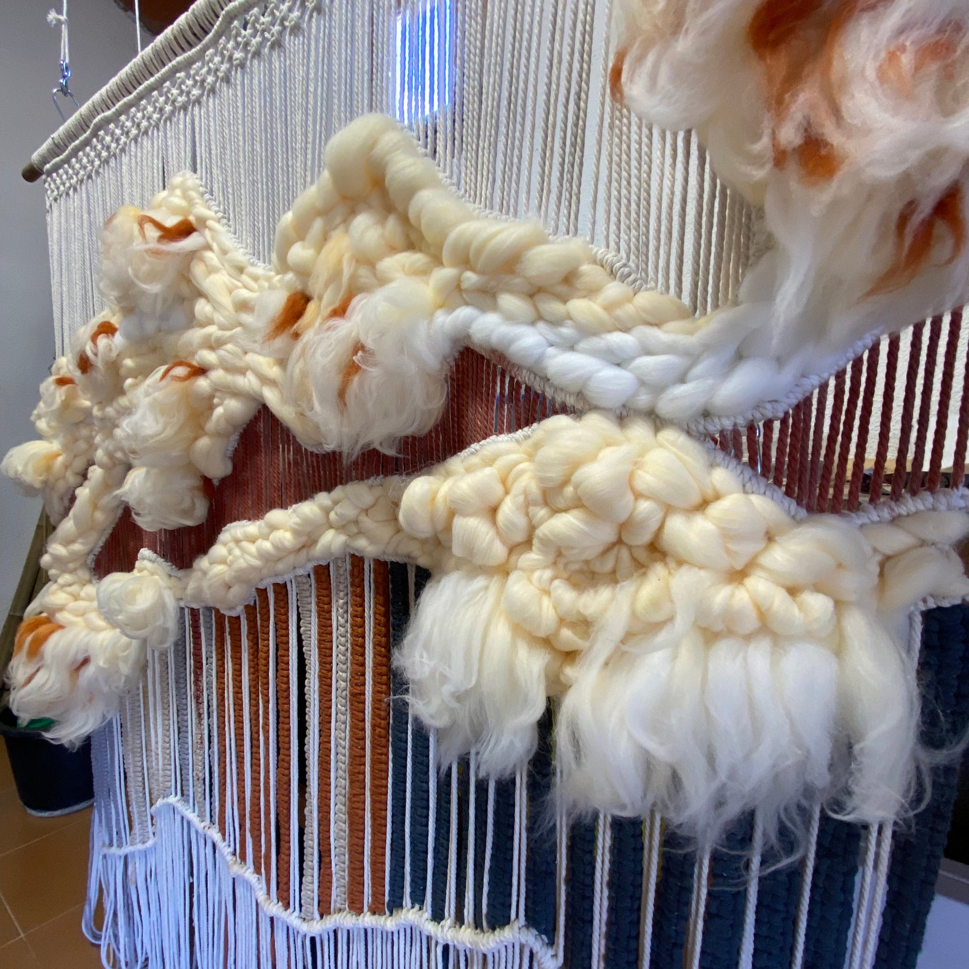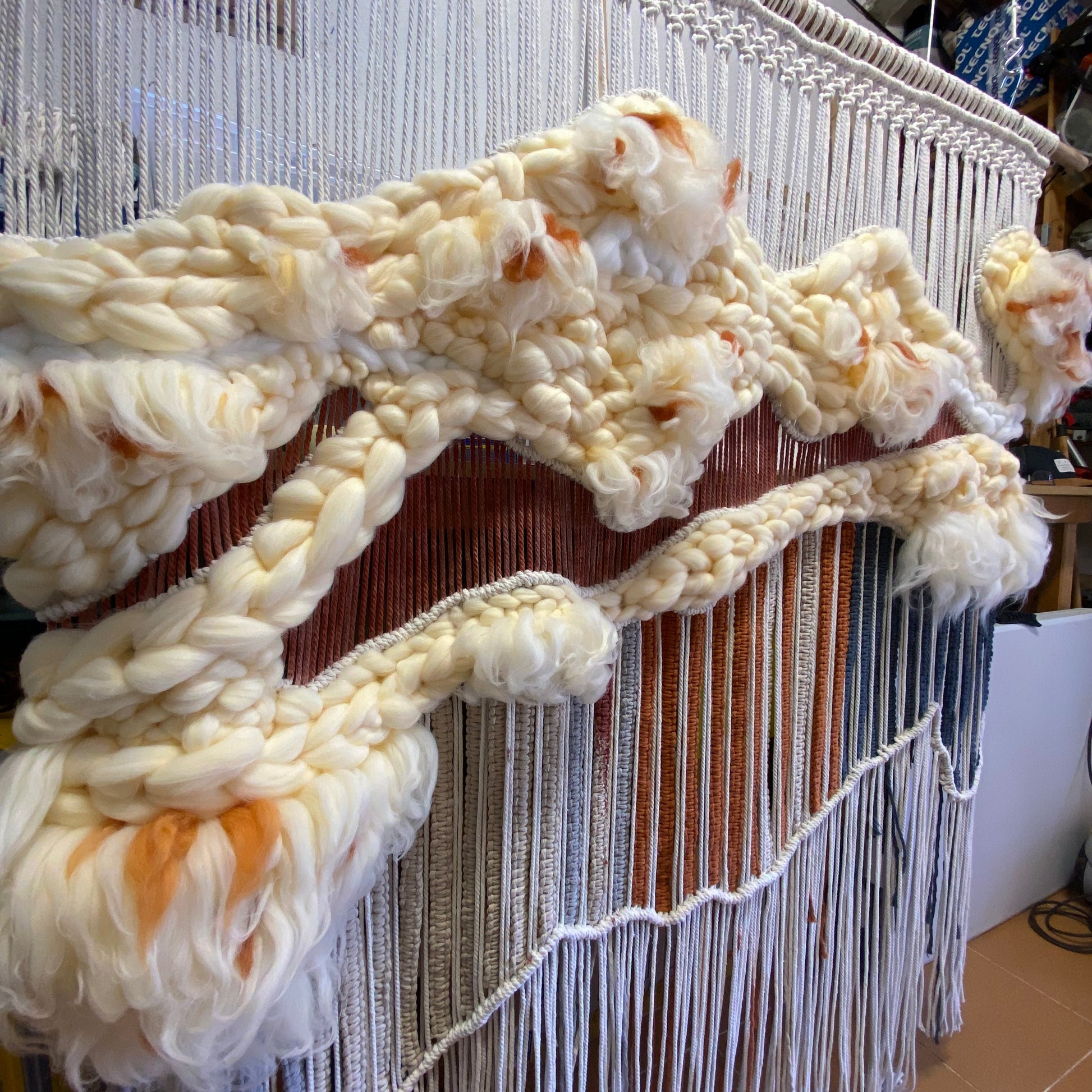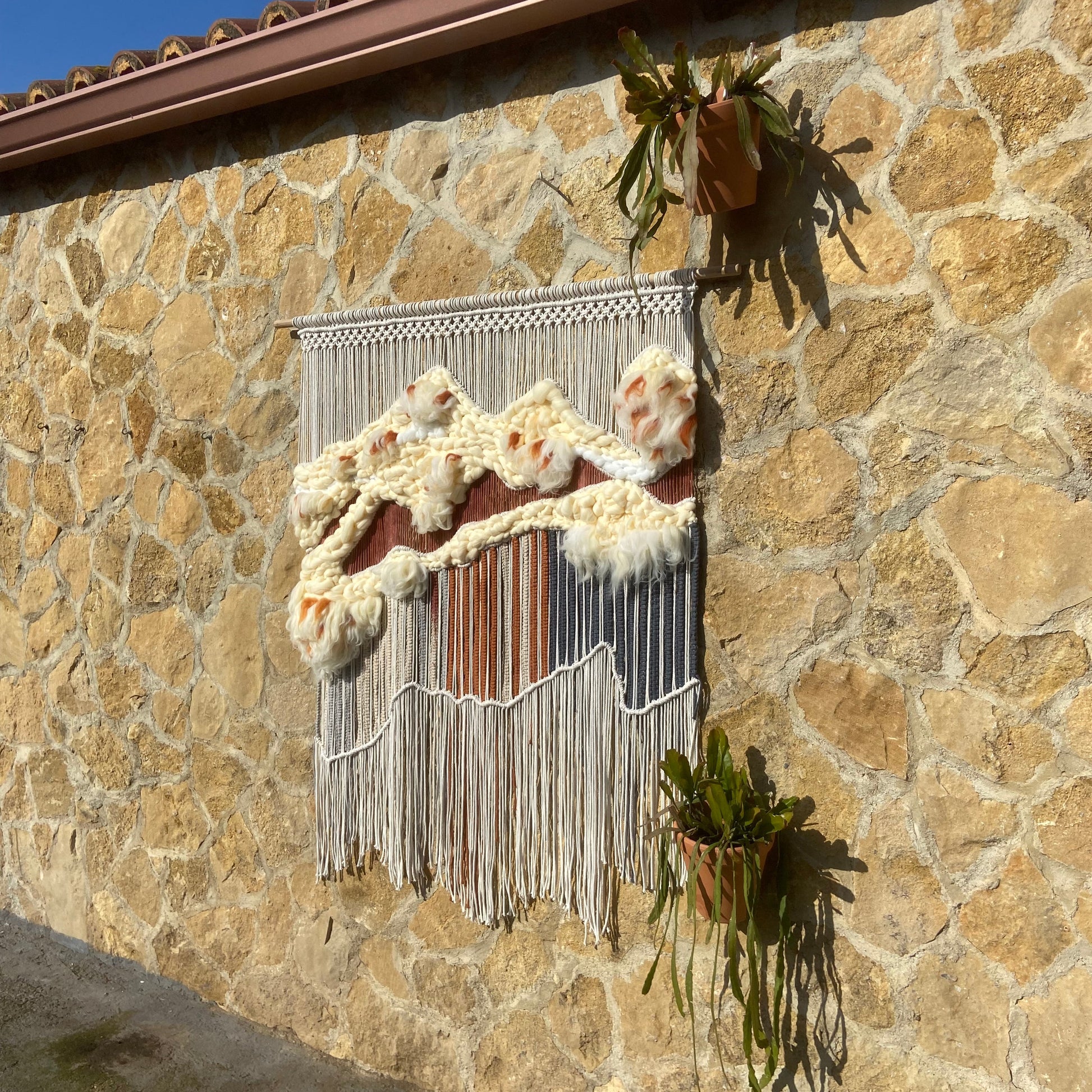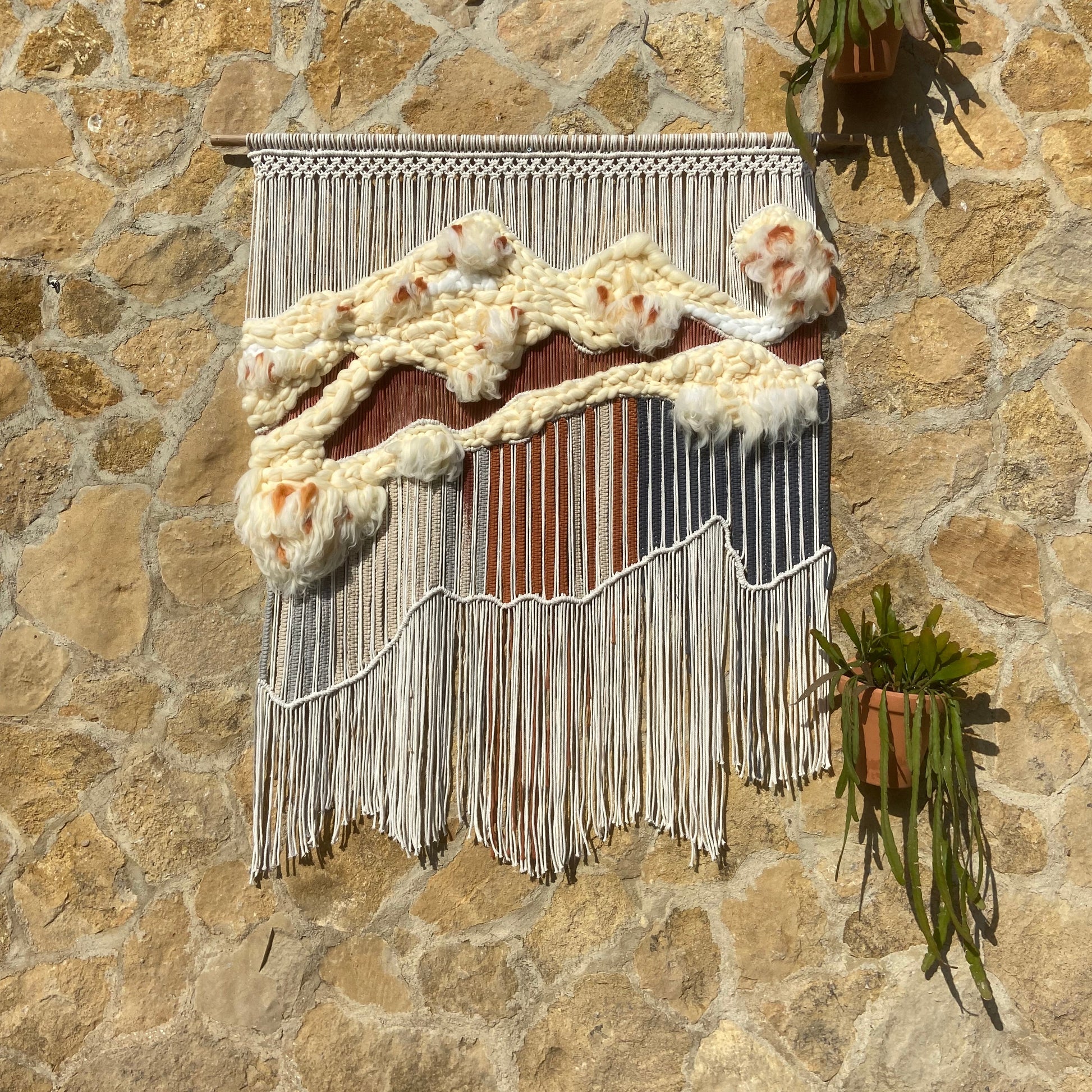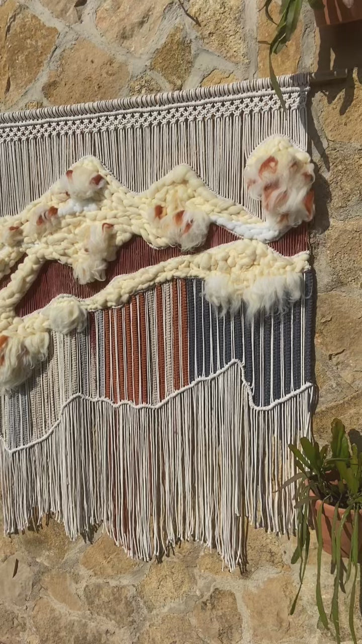 Déjate envolver por la magia de 'Horizontes Suspendidos', un tapiz que trasciende la decoración para convertirse en una experiencia sensorial. Cada nudo de macramé ha sido cuidadosamente tejido a mano, creando una base de serenidad y calma. Sobre este lienzo artesanal, suaves nubes de lana cardada flotan con una gracia etérea, susurrando historias de paisajes soñados y atmósferas envolventes.