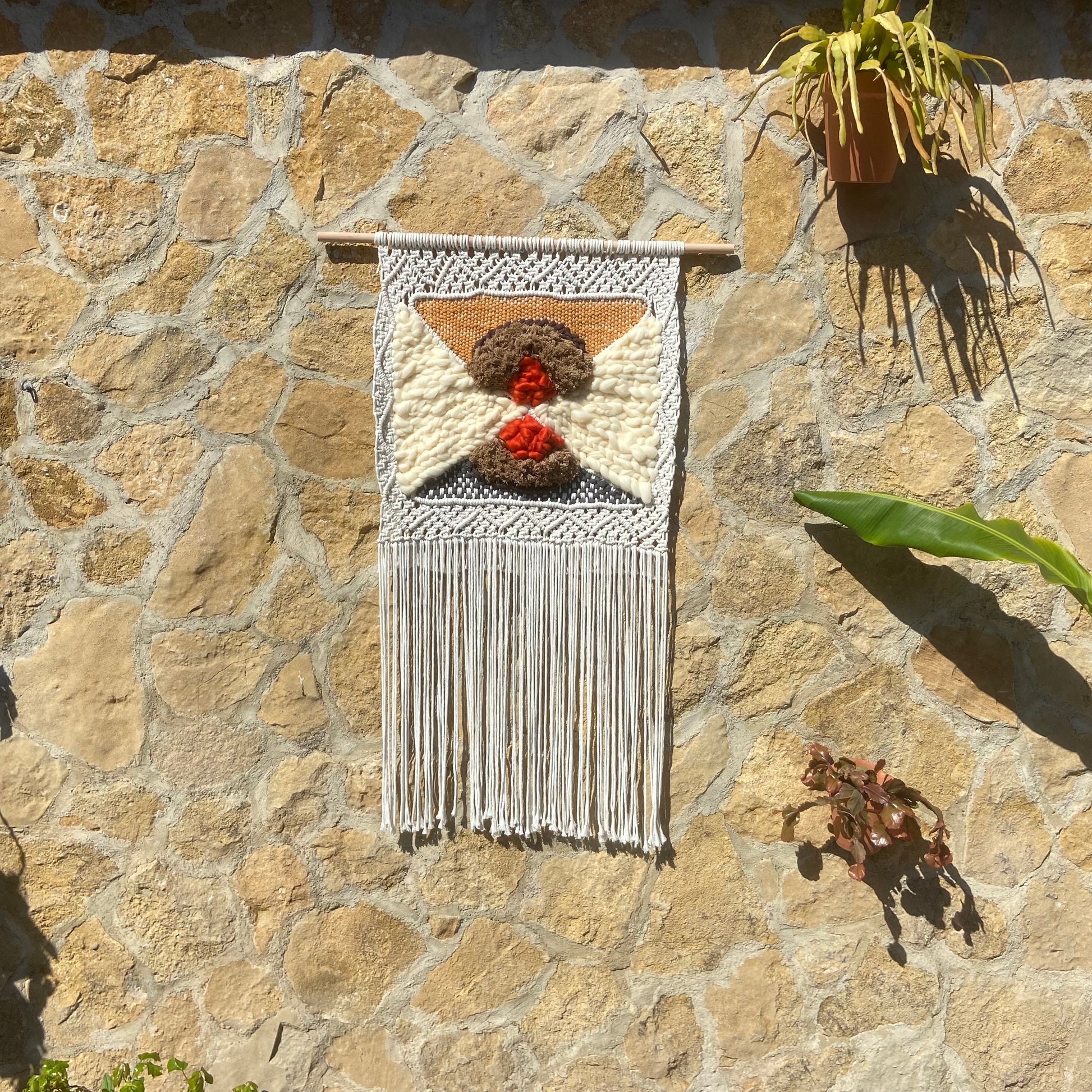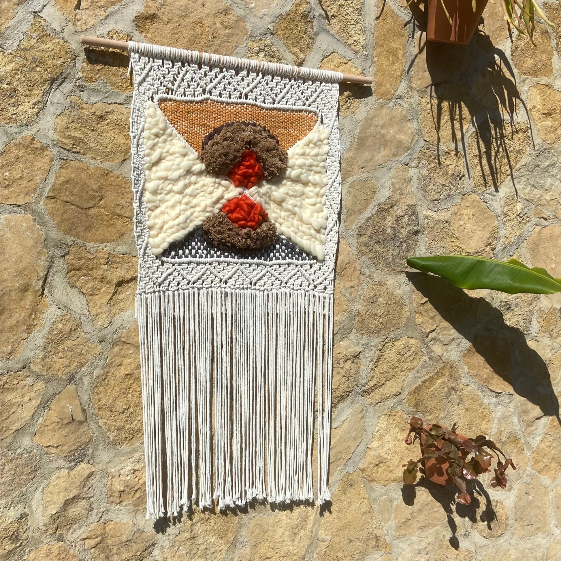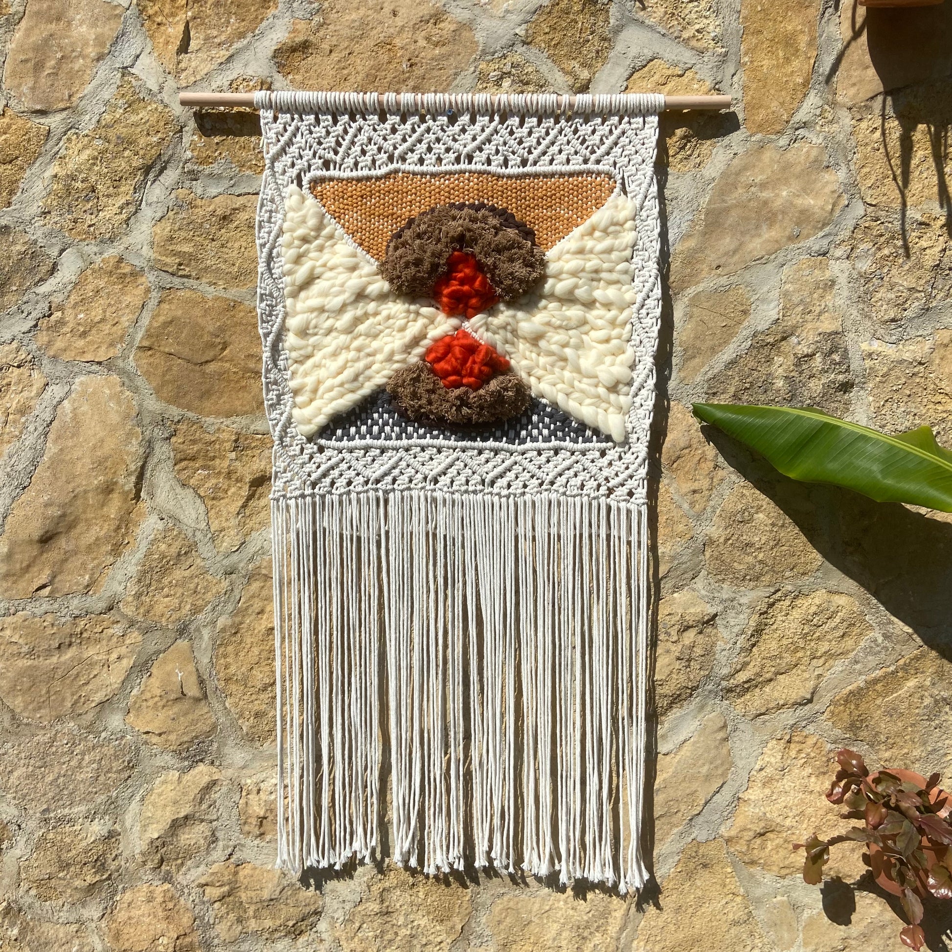 Descubre la intrigante composición de 'Convergencia Textil', un tapiz de macraweaving que juega con la superposición de formas y texturas. Los tonos neutros y terrosos se entrelazan en un diseño abstracto, donde círculos texturizados en marrón y toques de naranja vibrante se encuentran sobre un fondo de nudos geométricos en blanco y gris. La combinación de técnicas de macramé y tejido crea una pieza visualmente dinámica y táctilmente interesante. Sus largos flecos aportan movimiento y ligereza, haciendo de este tapiz una adición contemporánea y artística para cualquier espacio