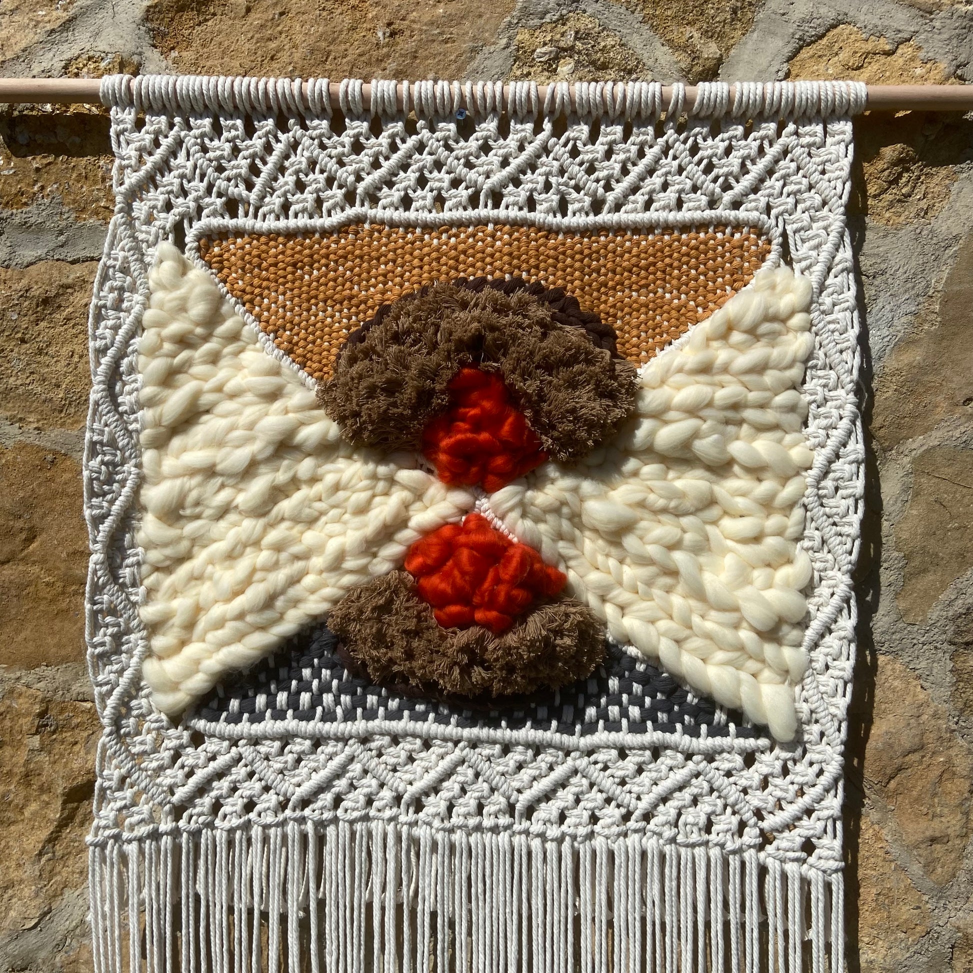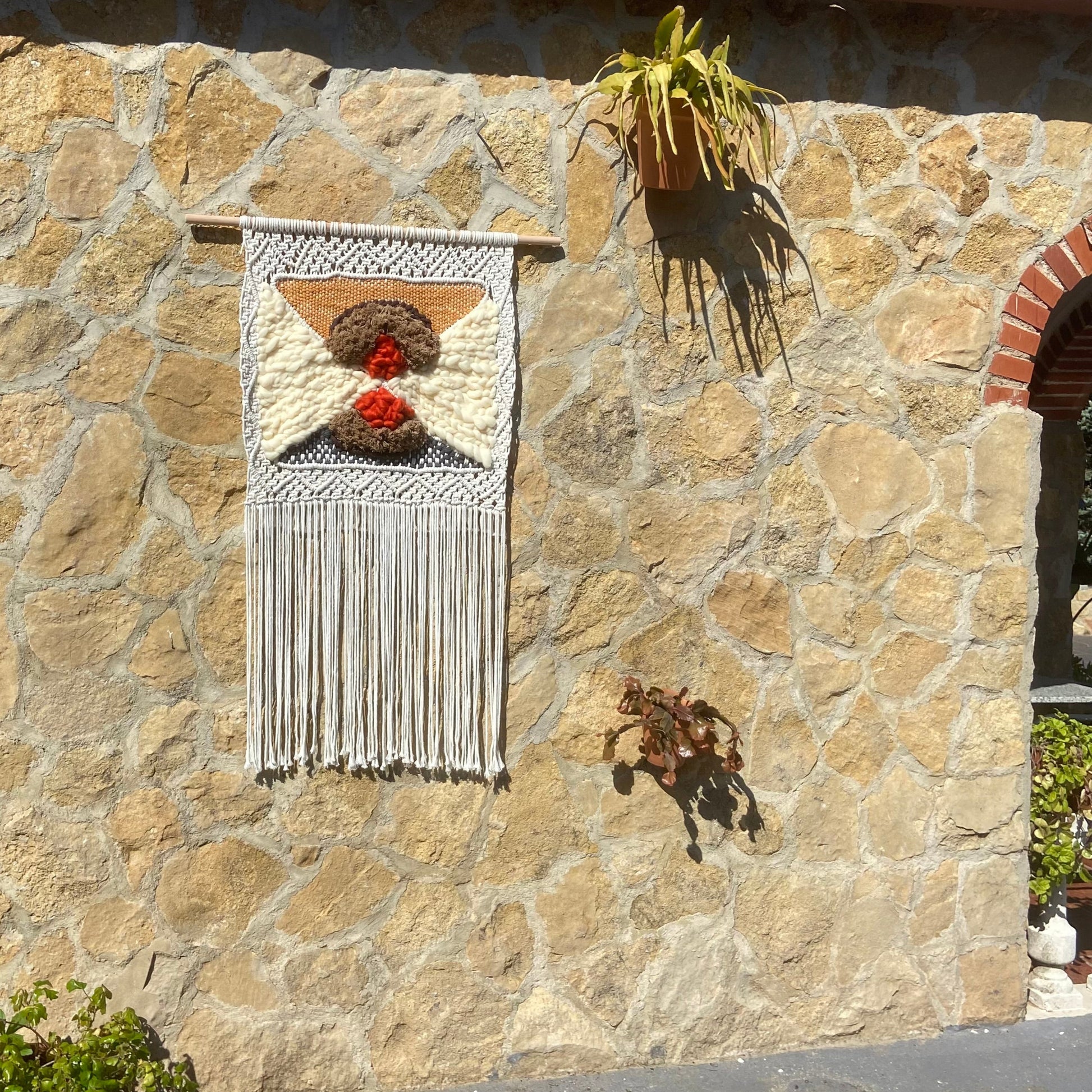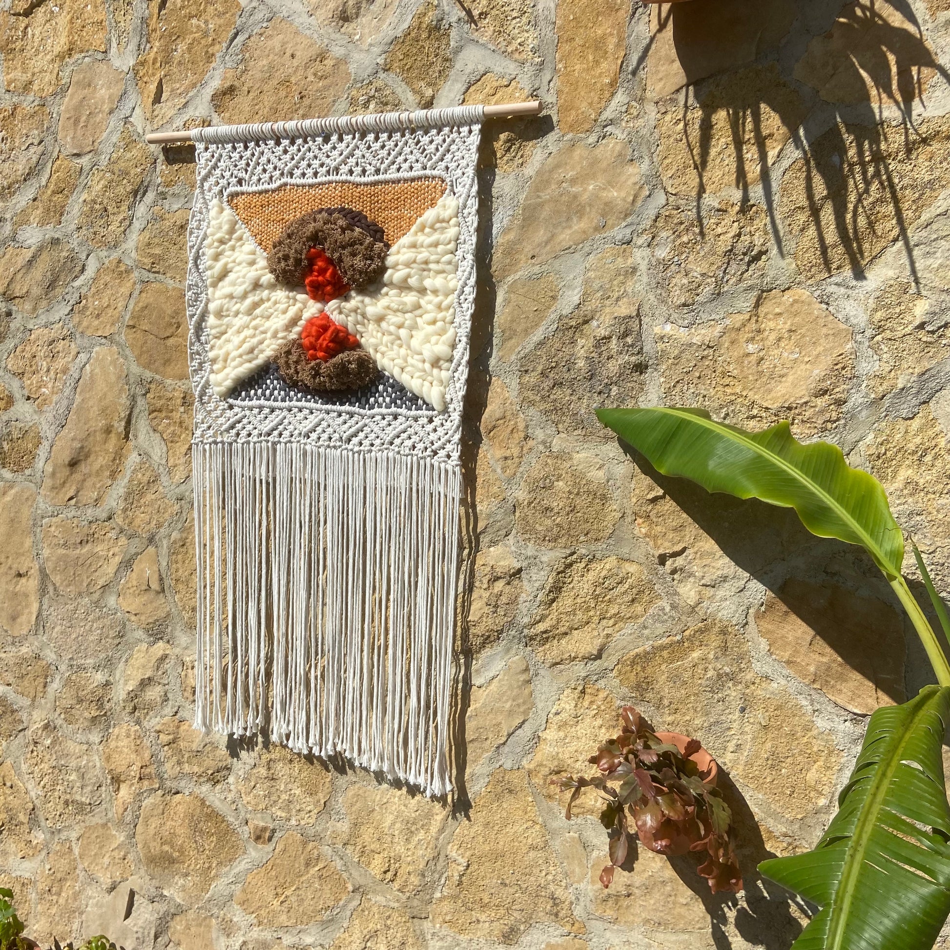 Descubre la intrigante composición de 'Convergencia Textil', un tapiz de macraweaving que juega con la superposición de formas y texturas. Los tonos neutros y terrosos se entrelazan en un diseño abstracto, donde círculos texturizados en marrón y toques de naranja vibrante se encuentran sobre un fondo de nudos geométricos en blanco y gris. La combinación de técnicas de macramé y tejido crea una pieza visualmente dinámica y táctilmente interesante. Sus largos flecos aportan movimiento y ligereza, haciendo de este tapiz una adición contemporánea y artística para cualquier espacio