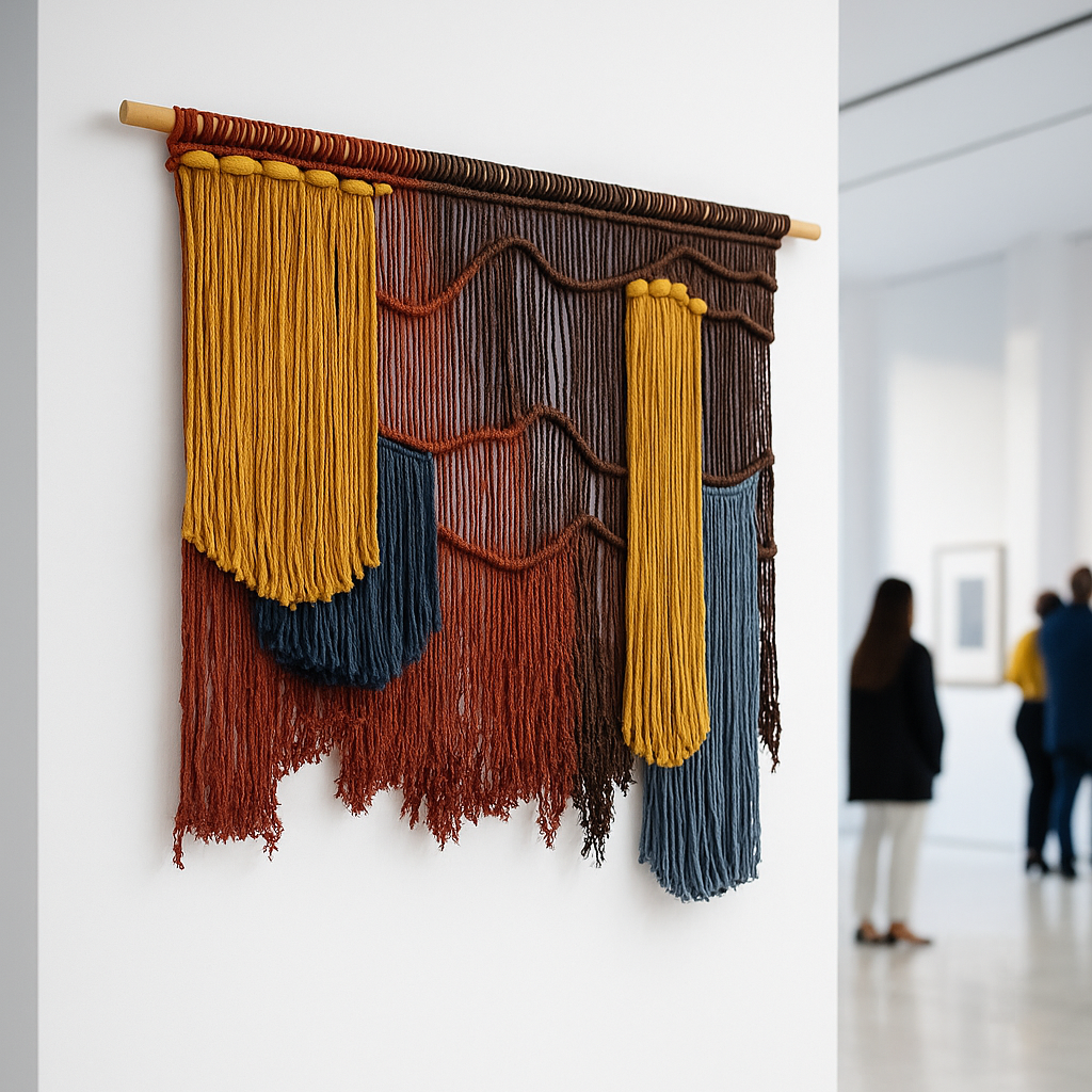 Este tapiz mural de diseño contemporáneo combina texturas orgánicas y colores cálidos para crear una pieza única de arte textil. Elaborado a mano con hilo de algodón natural de alta calidad, su composición juega con capas de mostaza, azul y burdeos que evocan paisajes naturales y movimiento.