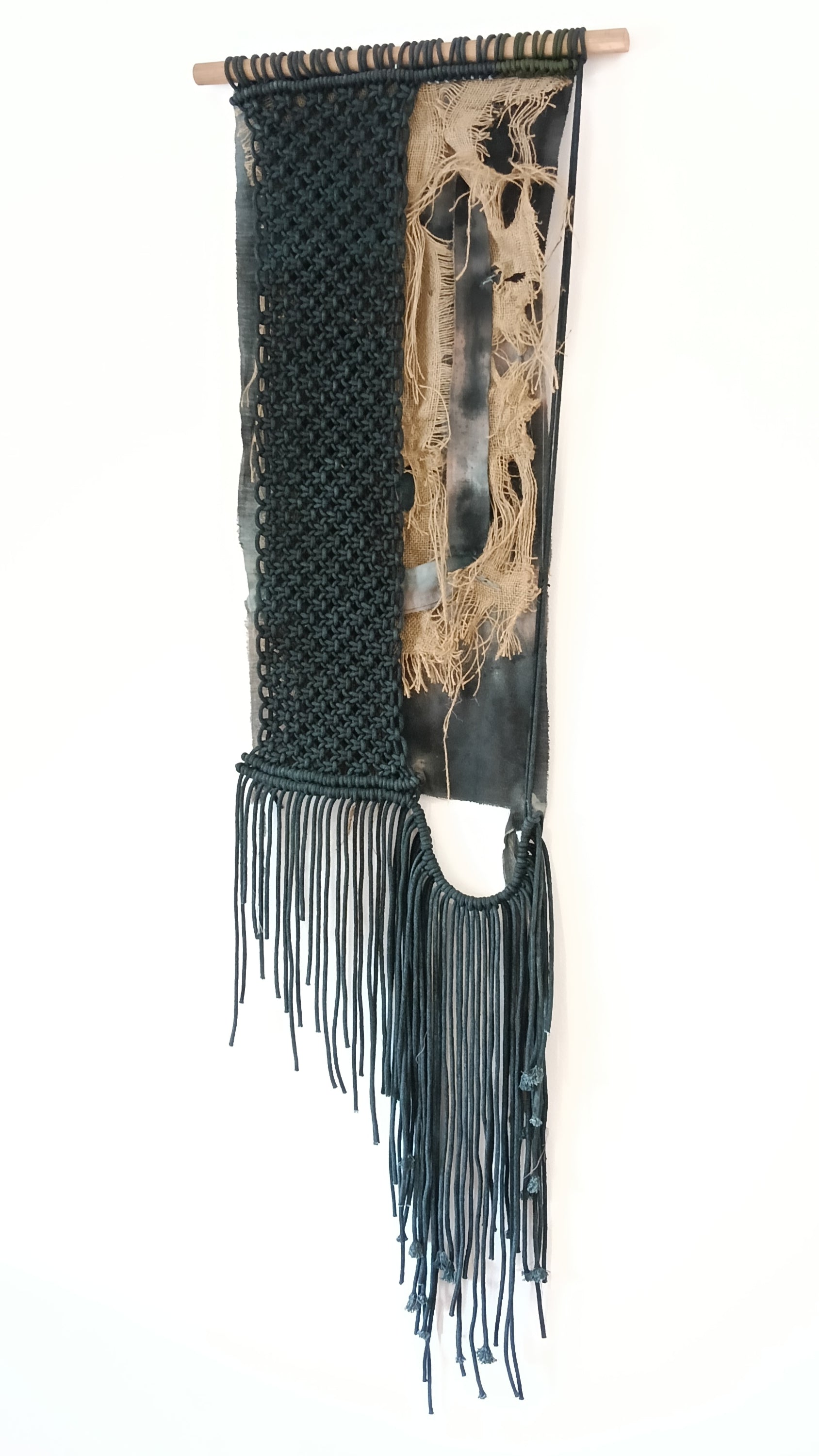 Este tapiz se distingue por su cautivadora composición asimétrica y la yuxtaposición de elementos. En un lado, el tejido macramé en tonos profundos de verde militar y gris oscuro se presenta con una estructura sólida y elegante, cayendo en flecos que añaden movimiento y fluidez. Al otro, fibras naturales de yute o lino sin tratar, con texturas rasgadas y orgánicas, se superponen sobre un fondo tintado con veladuras de grises azulados y óxidos velados, evocando la pátina del tiempo y la autenticidad de lo bruto. Un detalle colgante adicional de flecos sueltos añade un toque de rebeldía y equilibrio a la composición.
