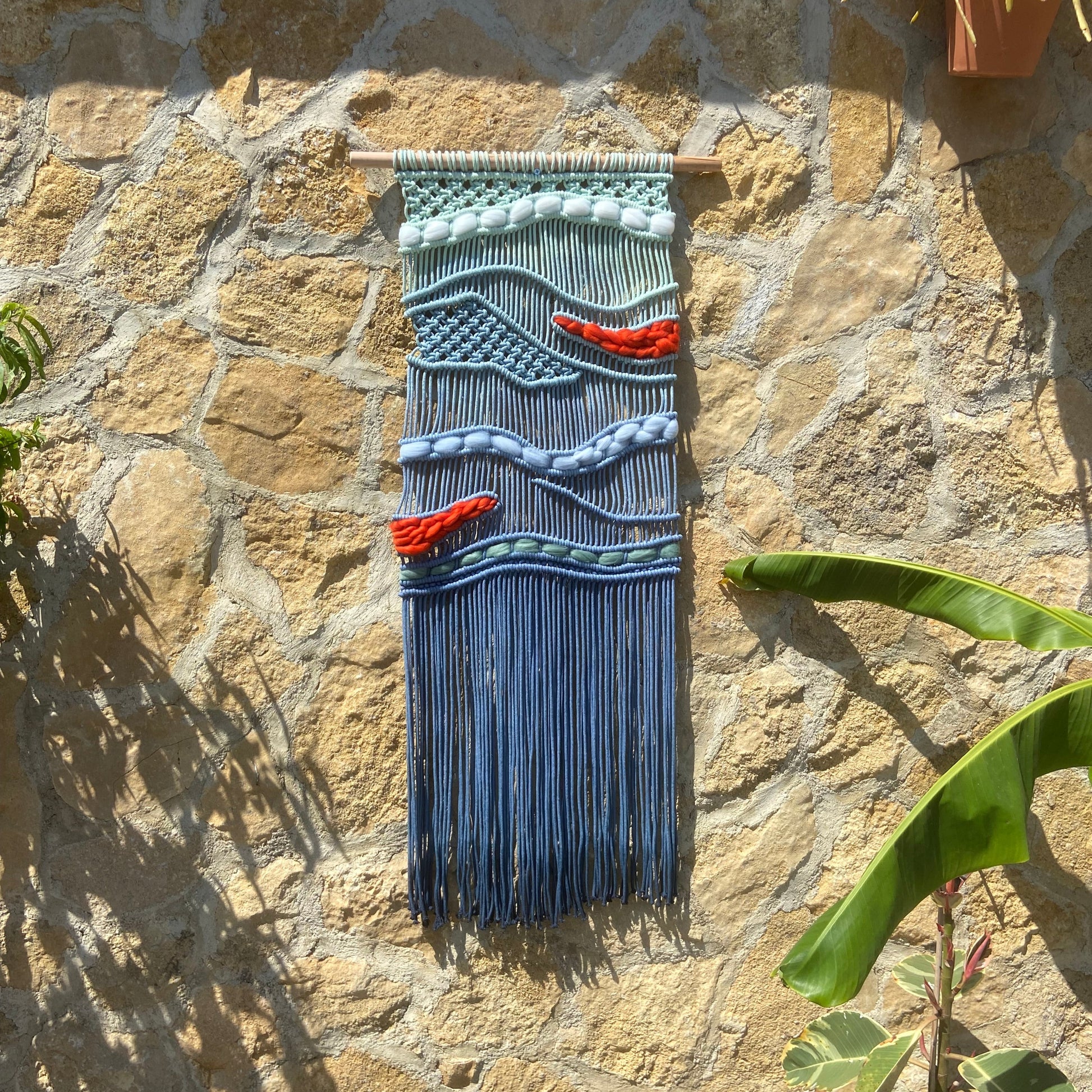 Este tapiz de macramé es una pieza única que evoca la serenidad del océano y la fuerza inesperada de la marea. Hecho completamente a mano, combina tonos azules en distintas profundidades, texturas suaves y acentos en rojo coral que simulan la energía vital que emerge del fondo marino.